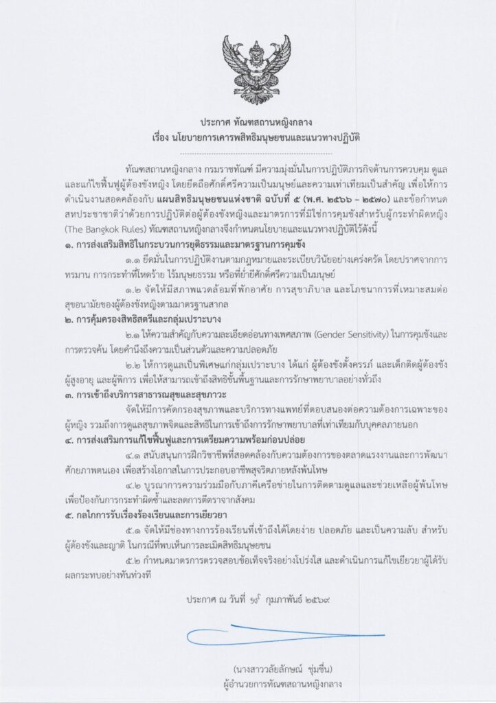ทัณฑสถานหญิงกลางให้ความสำคัญอย่างยิ่งต่อการเคารพศักดิ์ศรีความเป็นมนุษย์ ความเสมอภาค และการปฏิบัติต่อทุกคนด้วยความเป็นธรรม โดยยึดตามแผนสิทธิมนุษยชนแห่งชาติ ฉบับที่ 5 (พ.ศ. 2566 – 2570) ในการดำเนินงาน